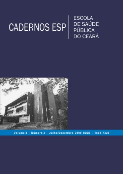 v. 2 n. 2 (2006)A revista “Cadernos da Escola de Saúde Pública” (Cadernos ESP), órgão oficial da Escola de Saúde Pública Paulo Marcelo Martins Rodrigues da Secretaria de Saúde do Estado do Ceará foi criada em 2005 com a missão de publicar artigos originais e inéditos de natureza científica, apresentando resultado de pesquisas relevantes para a saúde pública, de interesse regional nacional e internacional, visando à redução das desigualdades em saúde no Brasil.